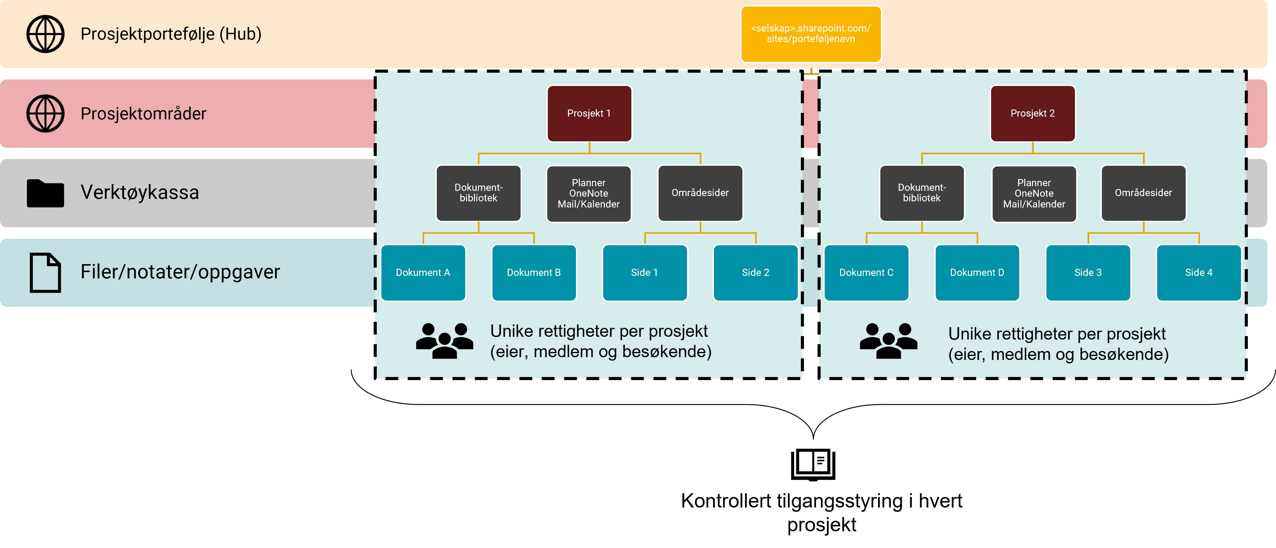 2) Under toppnivået (med egne SharePoint-områder) ligger alle prosjektområdene (illustrert med rosa). Hvert prosjektområde inneholder et enkelt prosjekt.