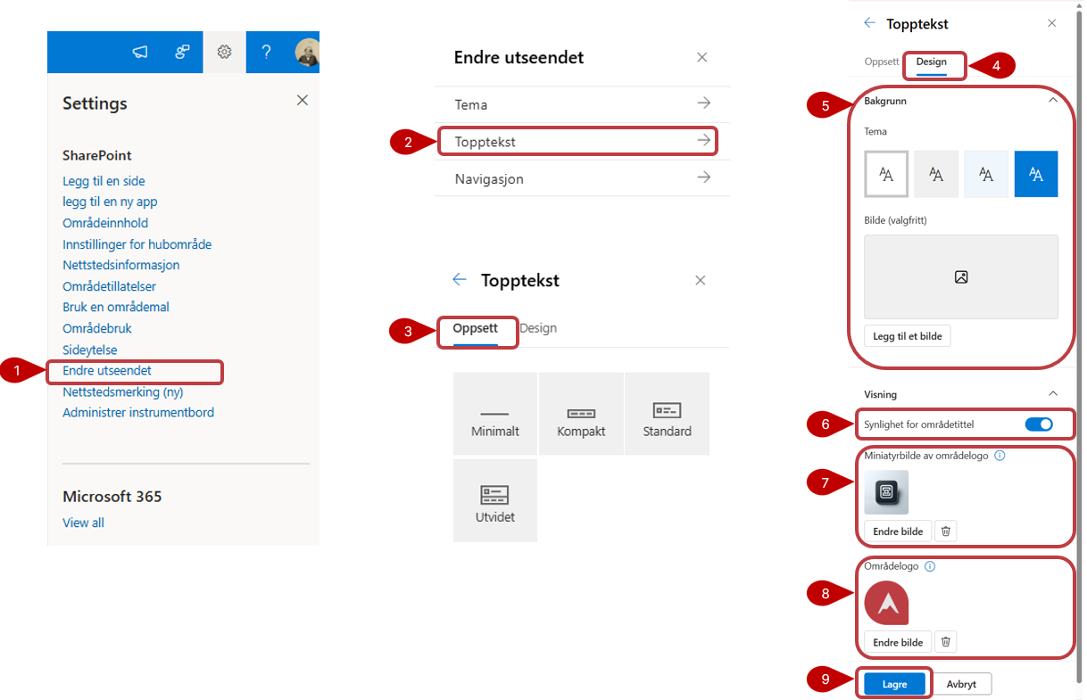 - Områdelogo, logo som vil vises i toppteksten for området, som kan være gjennomsiktig eller ikke-gjennomsiktlig.