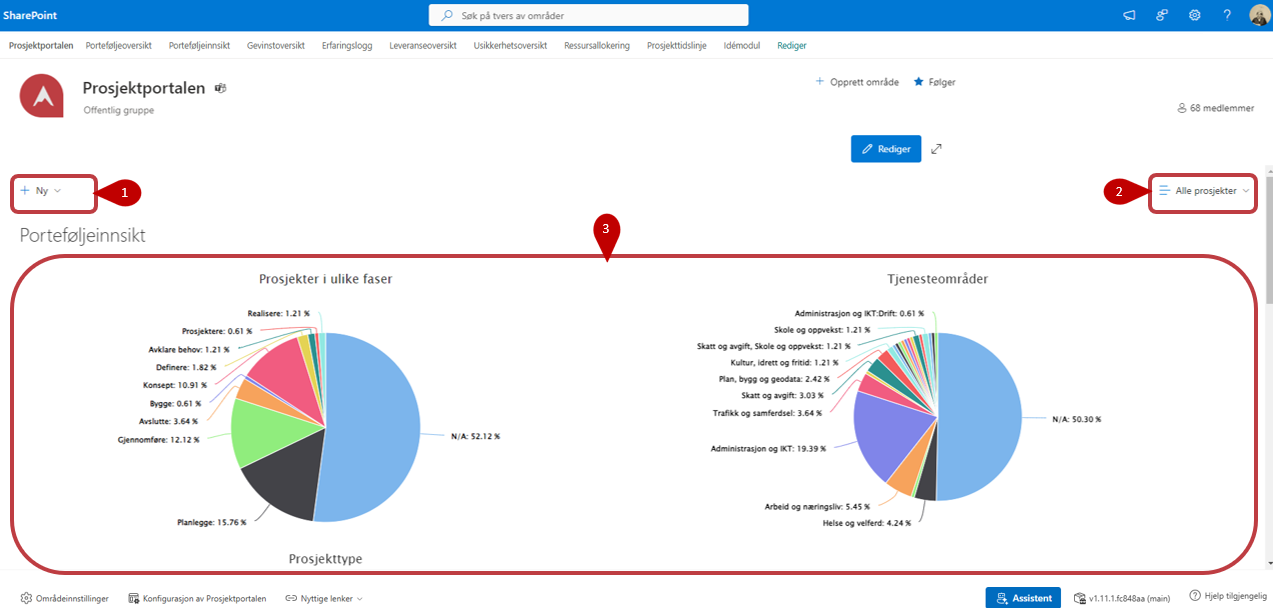 Med porteføljeinnsikten vil du kunne sammenstille data om prosjektet, og vise disse med grafiske elementer. Det finnes flere visninger som er forhåndsdefinert i Prosjektportalen, og nye kan også settes opp om ønskelig.
