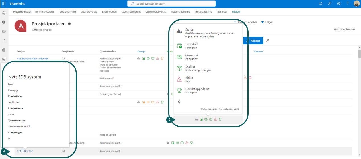Status ikoner: Disse ikonene gir en visuell og øyeblikkelig oversikt med status for prosjekter i pågående fase. Se bilde og mer info under (B).