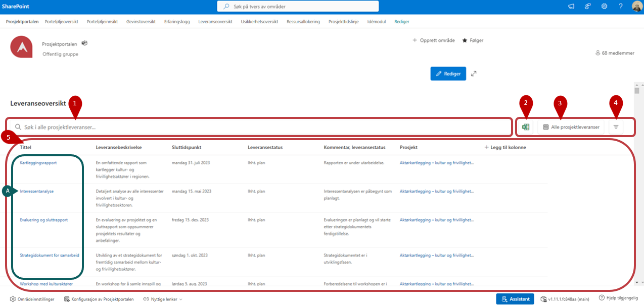 Leveranseoversikten viser alle leveranser fra alle prosjekter. Det er kun leveranser fra de prosjekter du har tilgang til som er synlige for deg. For å endre på innholdet i Leveranseoversikten henviser vi til manualen for administratorer av Prosjektportalen.