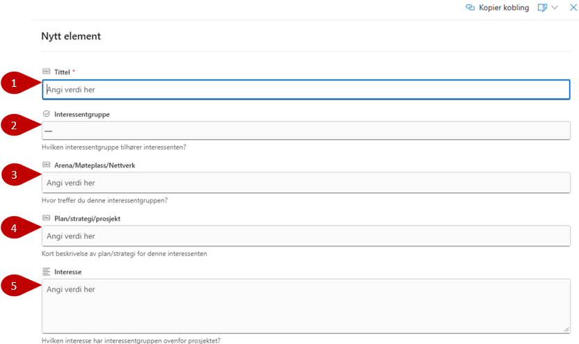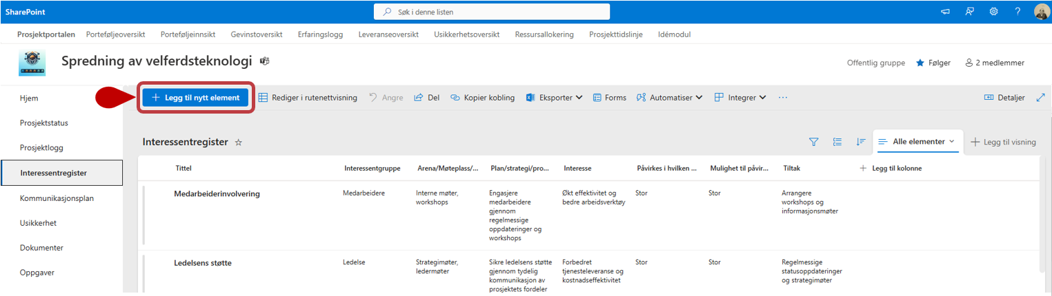 Trykk på Legg til nytt element for å opprette nytt interessentregister.