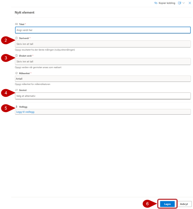 Med måleindikatorer setter du opp hvilke konkrete måleparameter du ønsker å måle i prosjektet. Les under her for mer informasjon om opprettelse av nytt element i listen