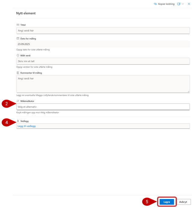 - Ved registrering av en måling velger du hvilken måleindikator den aktuelle målingen gjelder for.