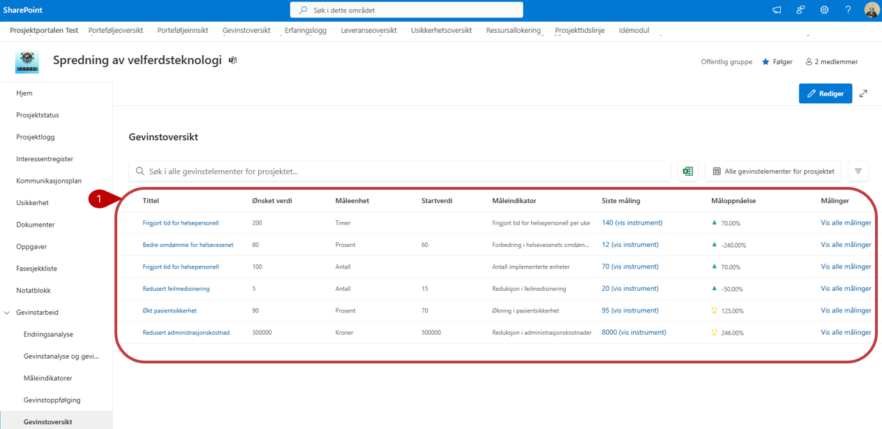 Gevinstoversikten blir automatisk generert når det er registrert gevinster, og målinger av gevinster, i prosjektet.