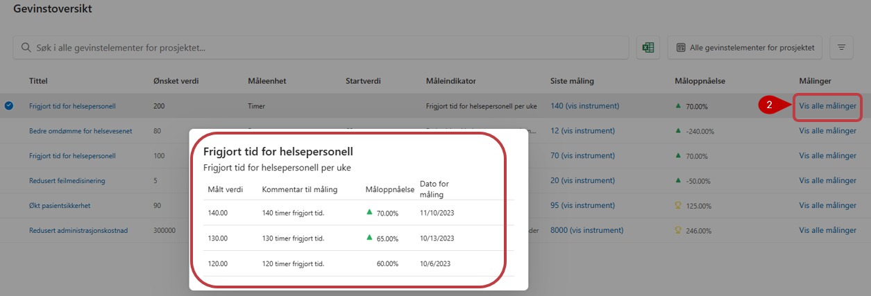 Ved å klikke på Vis alle målinger til høyre på en av linjene, vil du kunne se alle målinger utført for denne gevinsten.