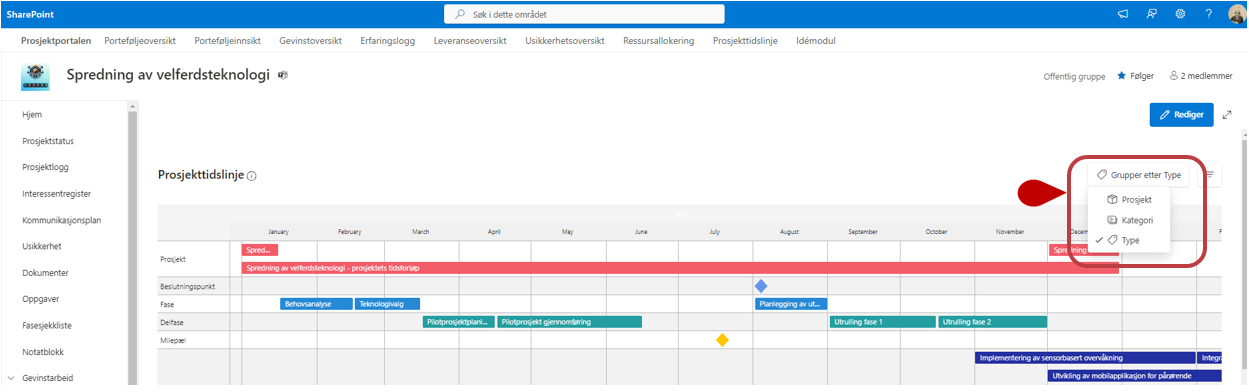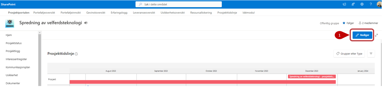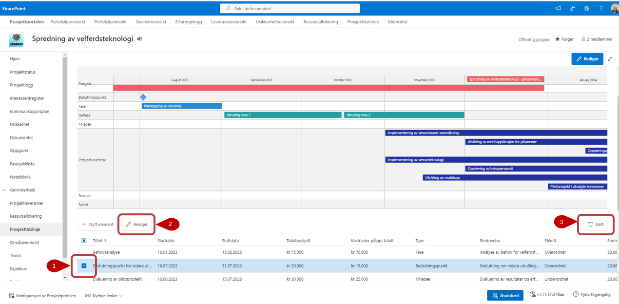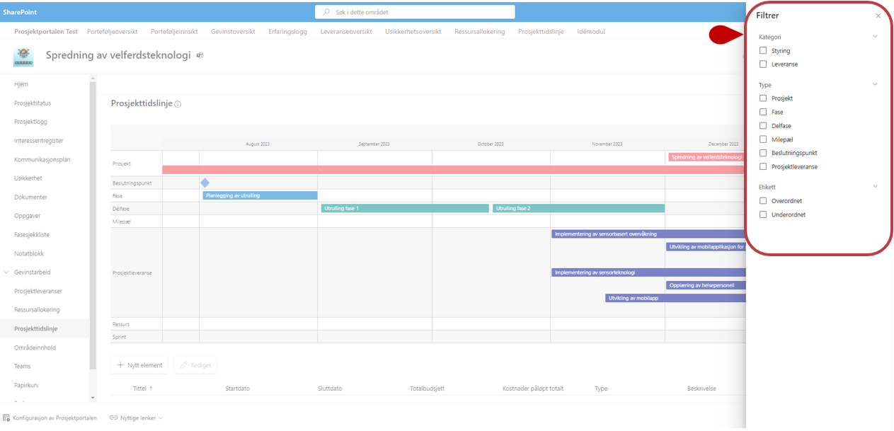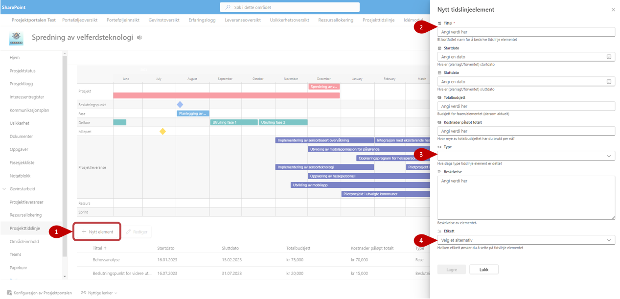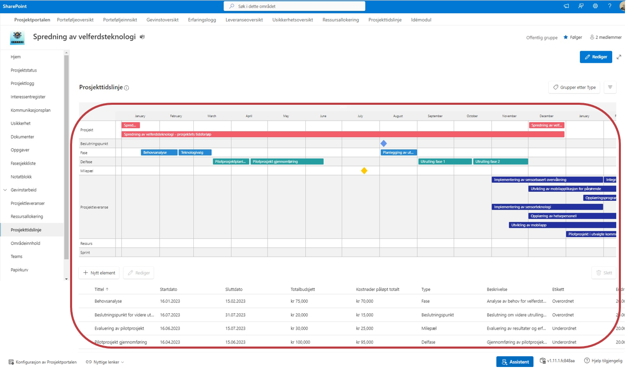 Her listes listeelementene for prosjektet i en visuell visning. Her kan du redigere og legge til nye elementer. Dette vil synkroniseres til listen på hubområdet.