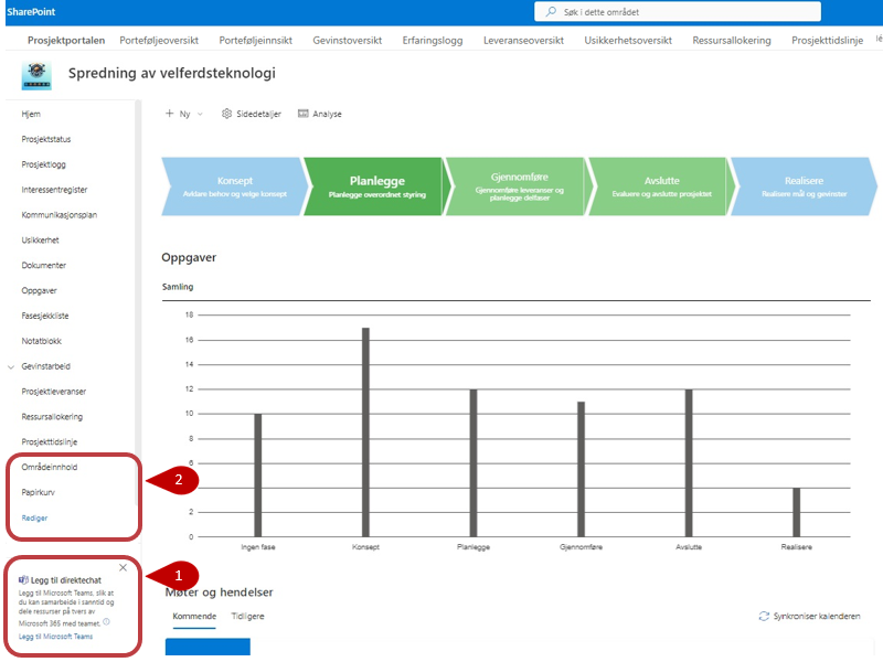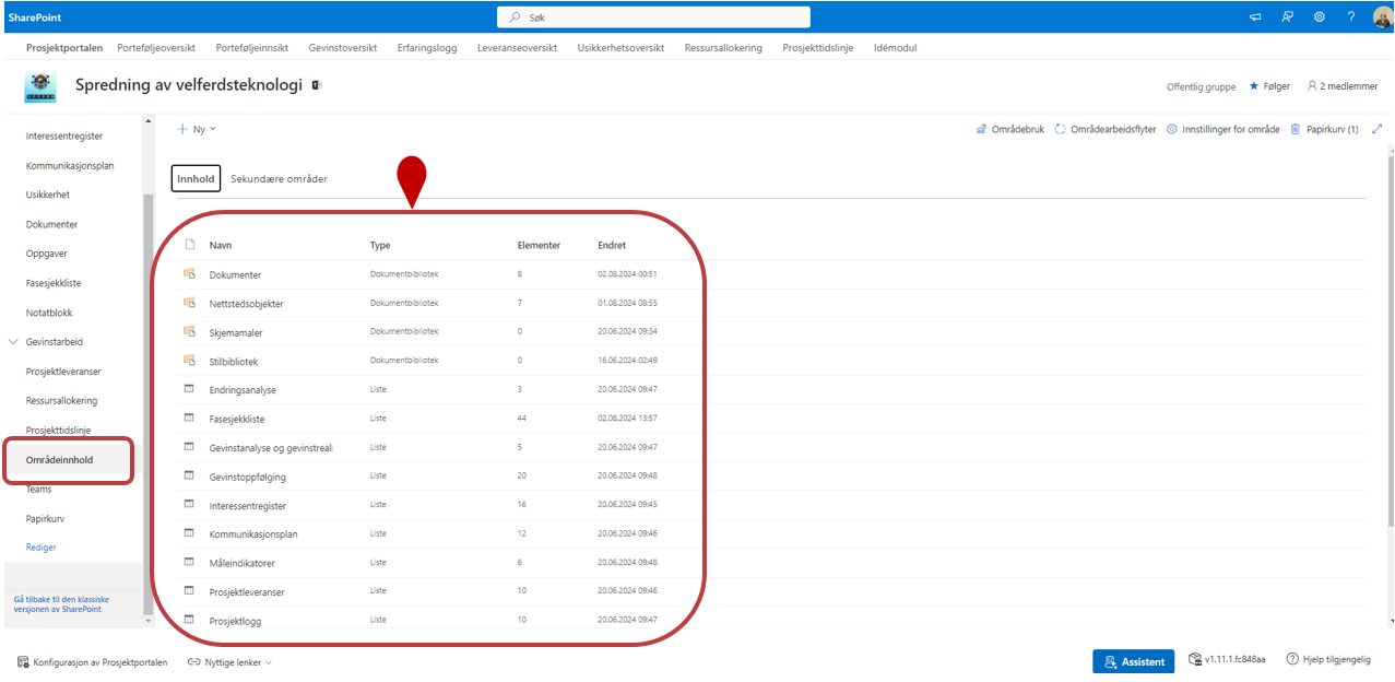 Her finner du alle lister og bibliotek som er tilgjengelige i prosjektet. Du kan lære mer om Områdeinnhold i Microsoft sine egne supportsider