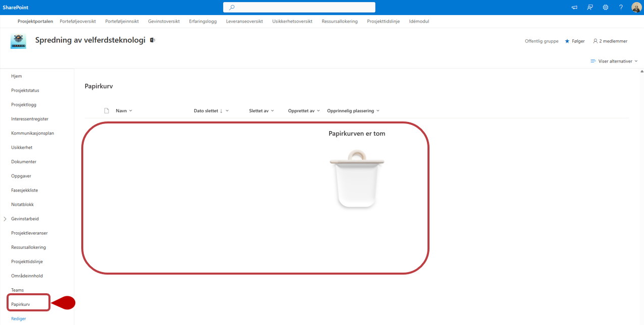 Her finner du alt du har slettet fra prosjektområdet, og kan gjenopprette elementer om du har slettet noe ved uhell. Områdeeier kan se alt som er slettet, og kan gjenopprette uavhengig om det ble slettet av noen andre. Du kan lære mer om papirkurven i Microsoft sine egne supportsider.